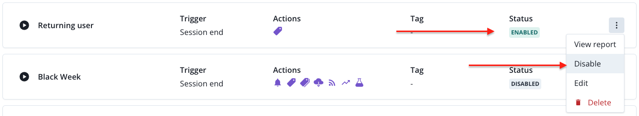 To change the status to enabled or disabled, simply click on the three dots and select it from the drop-down list: