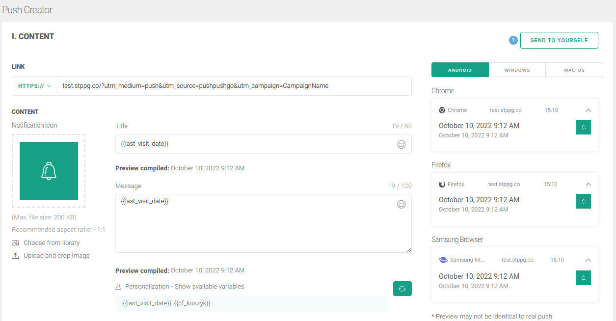 You don't have to do anything to choose the type of personalized campaign. All you need is to use the nunjucks syntax in the Title, Content, or Link fields.