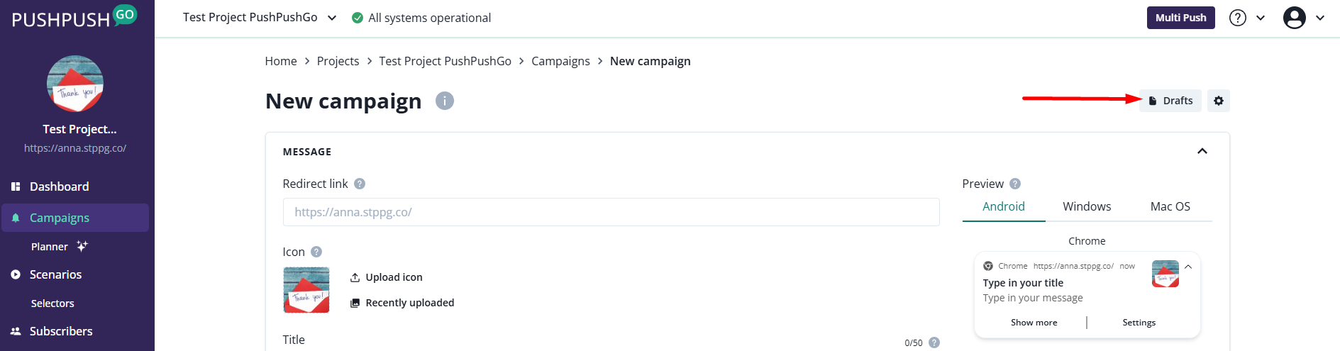 Campaigns saved as a drafts are available in the campaign creator after clicking the "Drafts" button: