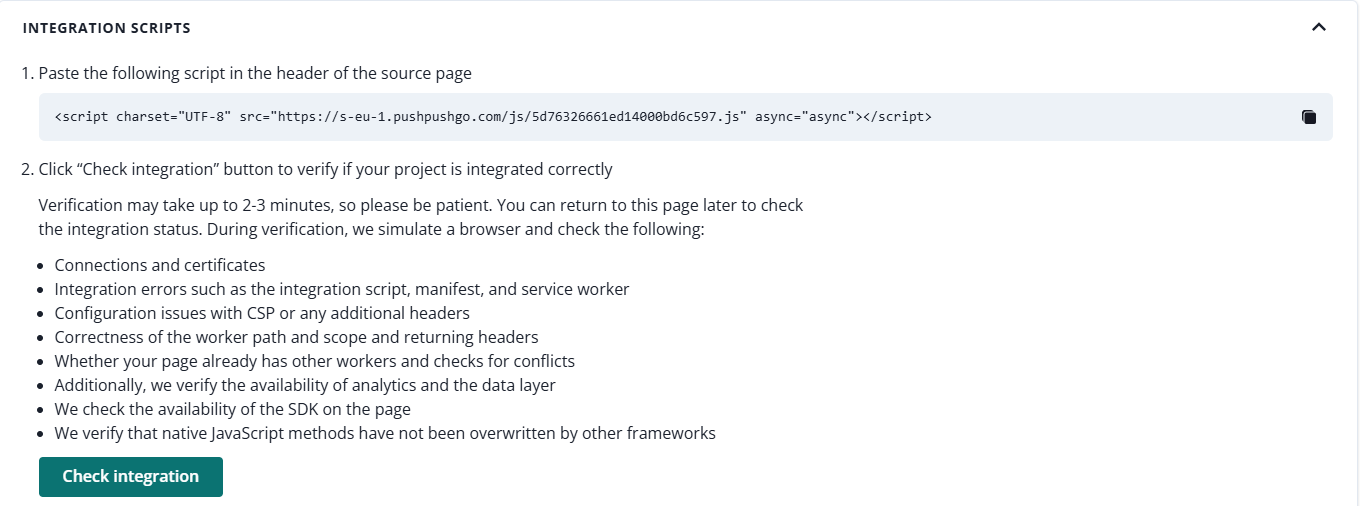 **Important!** In the case of integration with own domain, if you already have your service worker on the site and you can not delete it - import the contents of the sw\.js file into your file and be sure to inform us about it.